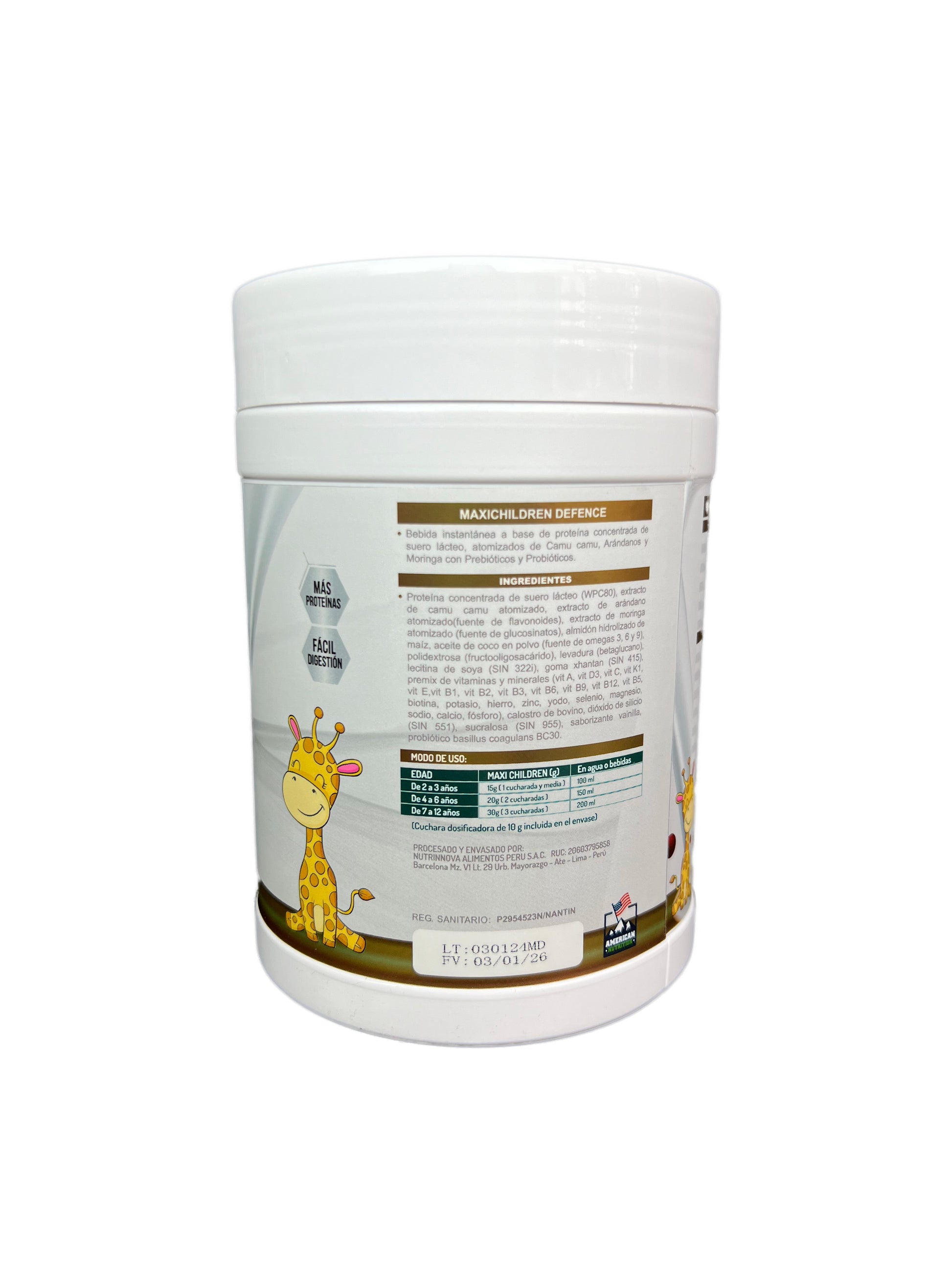 ¡Descubre MaxiDefense, la fórmula nutricional para niños de 2 a 12 años, diseñada para impulsar el sistema inmunológico y el crecimiento! Unica formula con proteína a base de calostro de bovino, que ofrece protección contra organismos causantes de enfermedades. Cuenta con los superfoods provenientes del arándano y moringa para estimular las células natural killer, ademas contiene antioxidantes del camu-camu que protegen contra la oxidación. La combinacion Vitamina C, magnesio y zinc ofrecen acción inmuno-moduladora. Además, el probiótico BC30 previene infecciones respiratorias. ¡MaxiChildren Defense, el aliado perfecto para la salud inmunológica de tus hijos!