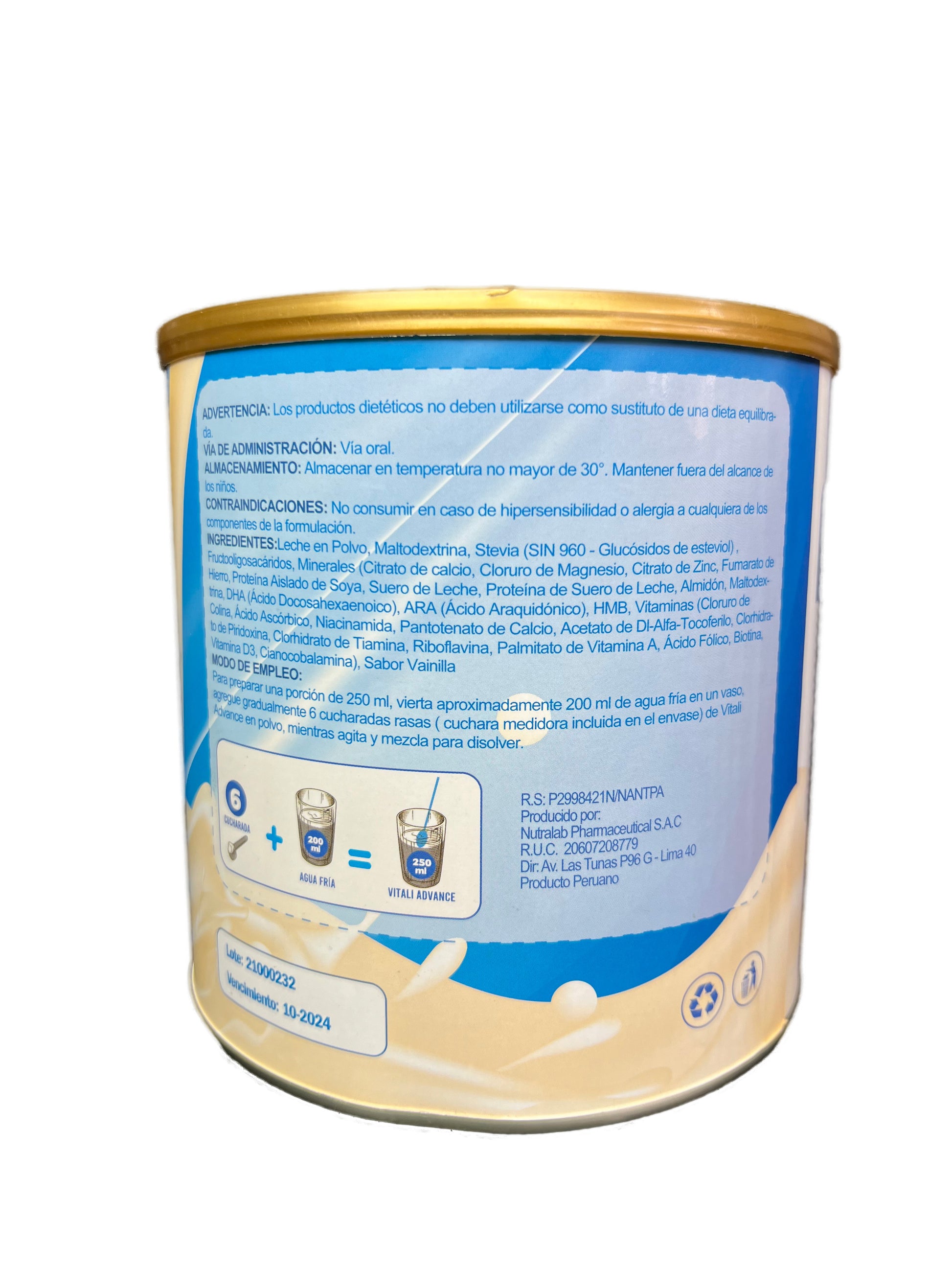¡Descubre Vitali Advance, el complemento nutricional para adultos de 45 a 65 años que potencia tu vida activa con energía y vitalidad! Con una fórmula balanceada de macro y micronutrientes, cada porción aporta 233 kcal, brindándote la energía necesaria. La combinación de 8.65 gramos de proteínas y HMB ayuda a ganar y mantener masa muscular, fortaleciéndote.